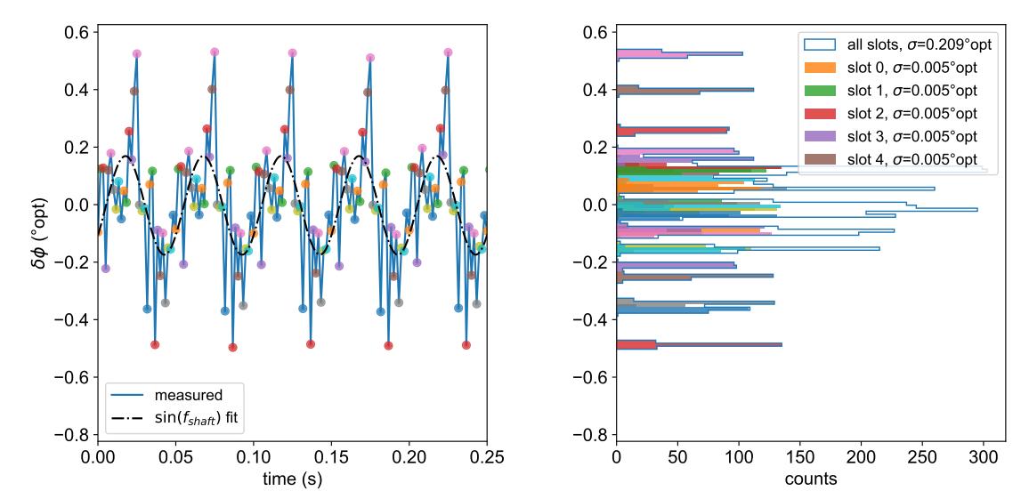 對(duì)于 n 槽葉片,每第 n 個(gè)周期測(cè)量都是對(duì)同一槽的重復(fù)測(cè)量。因此,我們?yōu)榕c該葉片的 5 個(gè)槽相對(duì)應(yīng)的周期測(cè)量值分配不同的顏色。以槽 1 為例(綠色)。它的平均周期誤差約為−0.65°opt。這意味著標(biāo)記槽位 1 周期結(jié)束的邊緣比預(yù)期早 0.65°opt。非確定性抖動(dòng)將綠色分布的寬度設(shè)置為僅為 0.070°opt,因此相位誤差從一轉(zhuǎn)到另一轉(zhuǎn)的再現(xiàn)性非常好,并且由確定性誤差主導(dǎo)。簡(jiǎn)單地說,對(duì)于單個(gè)槽位,相位誤差的確定性源確定平均值,而非確定性源確定抖動(dòng)(標(biāo)準(zhǔn)偏差)。