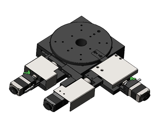 XYR對位平臺通常由上臺面、下底面和中間的四個模組構(gòu)成,從模組分布的結(jié)構(gòu)上分為:對稱結(jié)構(gòu)和非對稱結(jié)構(gòu),而對稱結(jié)構(gòu),又可分為“十字形對稱結(jié)構(gòu)”和“四角形對稱結(jié)構(gòu)”等。非對稱結(jié)構(gòu)通常用在超薄型或者客戶定制的需求中,而且通常中間不能設計通孔,所以在一些特定情況下使用。而對稱結(jié)構(gòu)在運動算法方面比較通用,而且對位平臺中心位置可以設計通孔,一定程度上可以滿足透射式和反射式的對位需求,故被廣泛采用。對稱結(jié)構(gòu)中的四角形分布,其剛性和可擴展能力更強,所以我司的對位平臺更多地采用四角對稱平臺。
