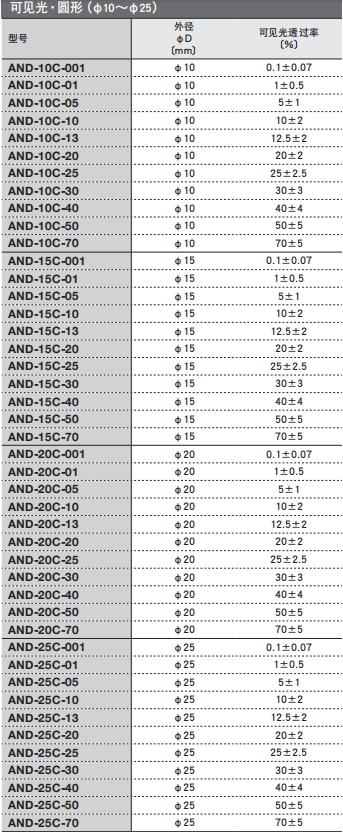 可見光·圓形選型表: