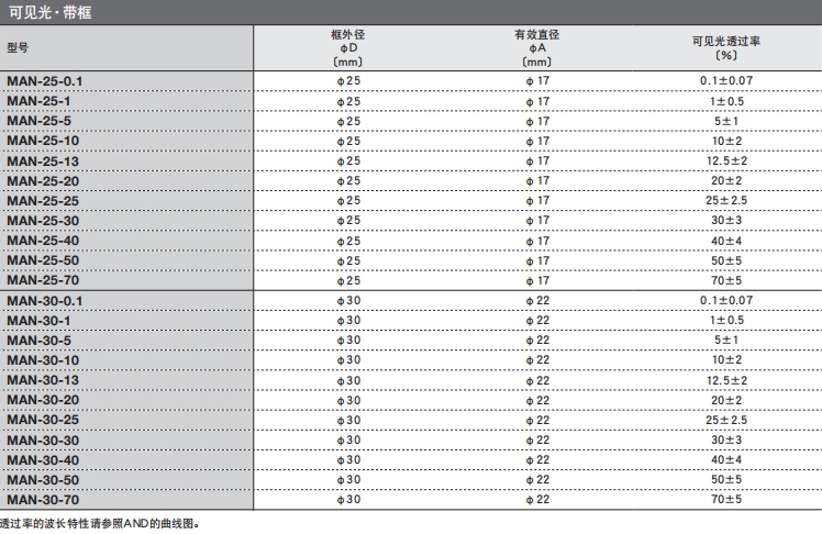?優(yōu)先透過率的特性,通過改變?yōu)V光片厚度調(diào)節(jié)實(shí)際的透過率性能。因此,每個濾光片厚度都不一樣。需要保持 (5mm以下) 厚度一致時,請使用帶框的濾光片(MAN/MANY)。
