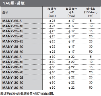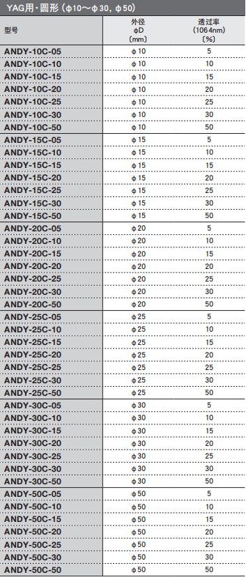 YAG用·圓形選型表: