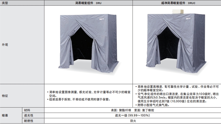 ?簡(jiǎn)易暗室組件由暗幕,管材,塑料錘組成。一般的組裝時(shí)間:(例)組裝DRU-1816約需要30分鐘(兩人)。