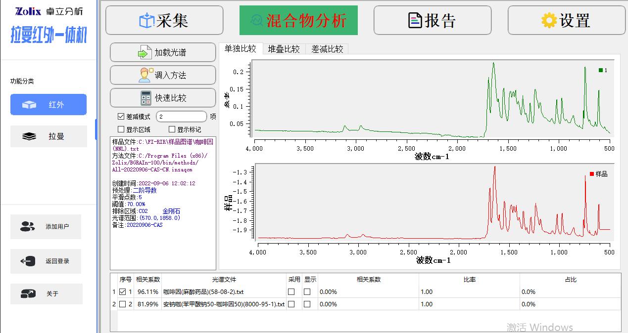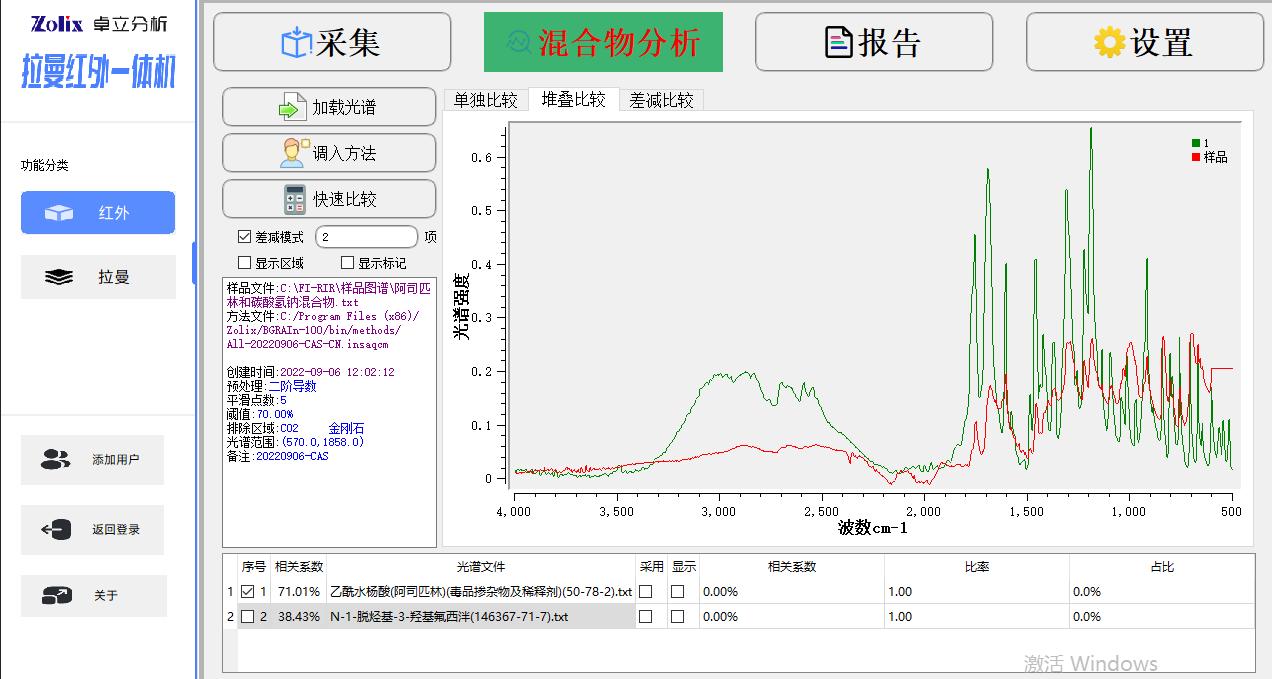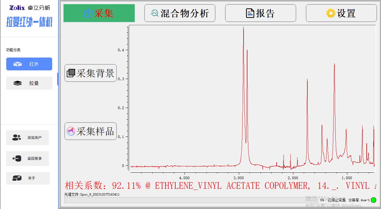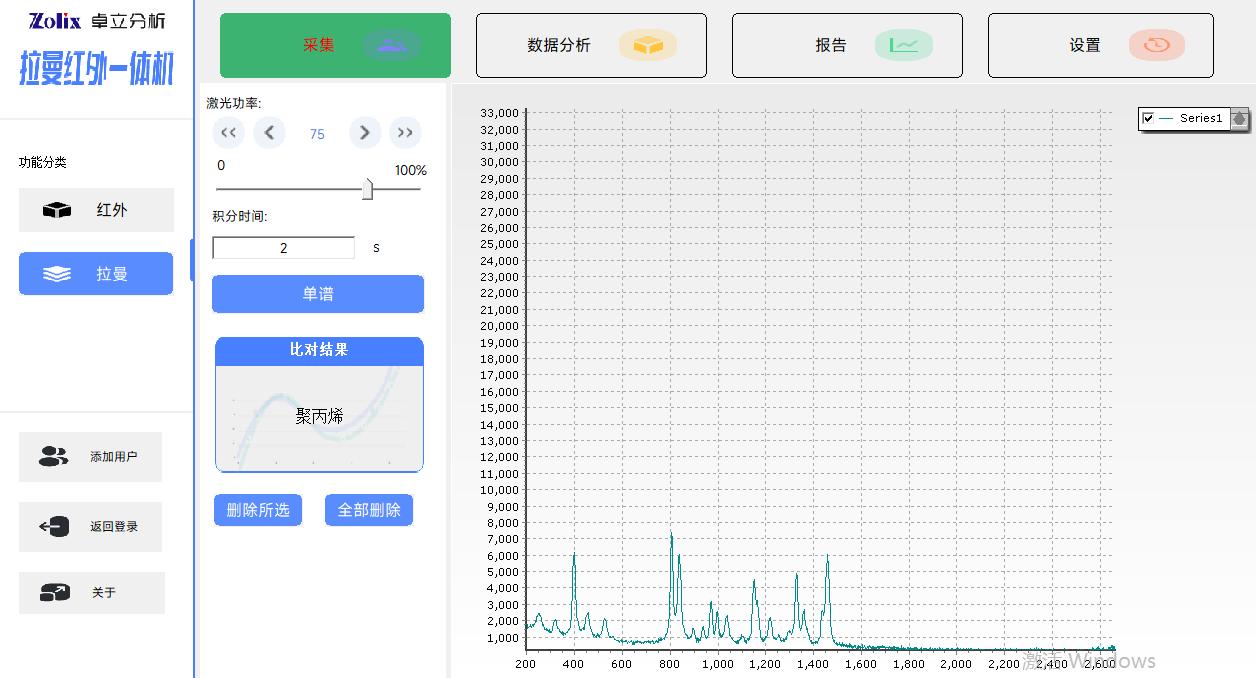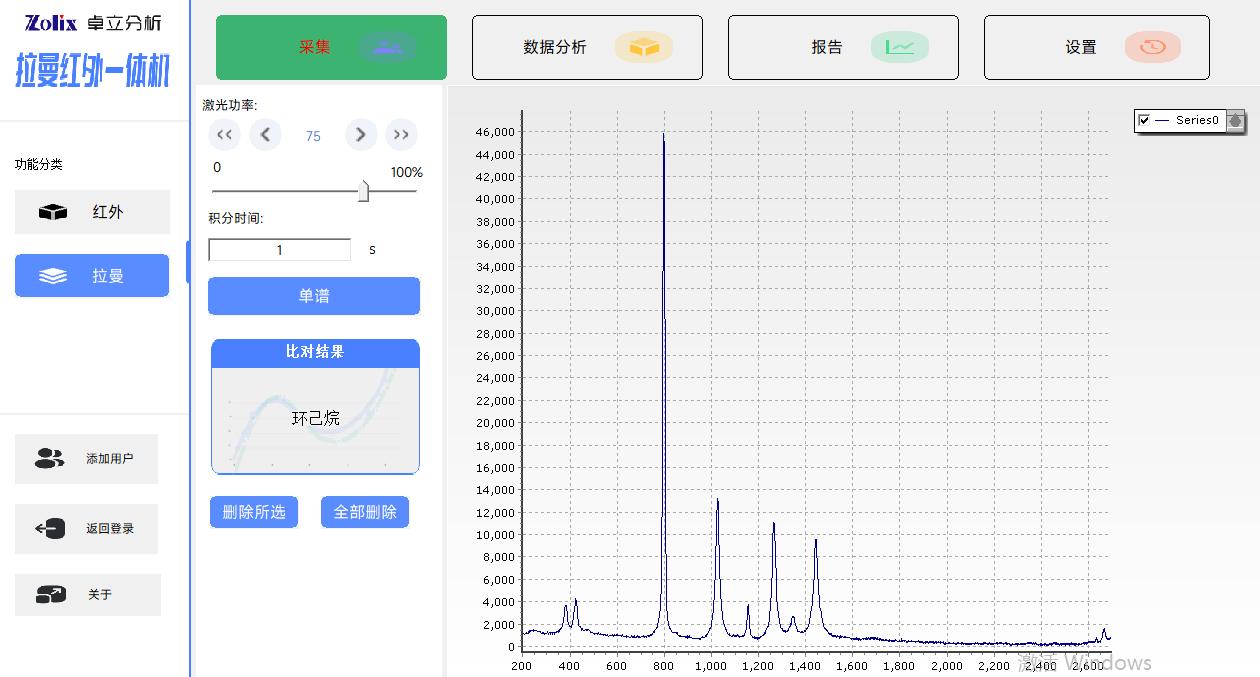 Win10操作系統(tǒng)下的全中文版處理軟件, 紅外模組功能包括:紅外光譜測量功能、光譜數(shù)據(jù)預(yù)處理功能、譜圖快速比較功能、標(biāo)準(zhǔn)譜峰檢索功能、用戶自建標(biāo)準(zhǔn)譜庫功能、定量分析功能、自動扣除金剛石/CO2吸收峰功能、智能峰位識別報警功能、一鍵式測評功能、報告自動生成及打印功能等 拉曼模組功能包括:拉曼光譜測量功能、譜圖快速比較功能、譜圖自動保存、批量刪除,報告自動生成及打印功能等 |