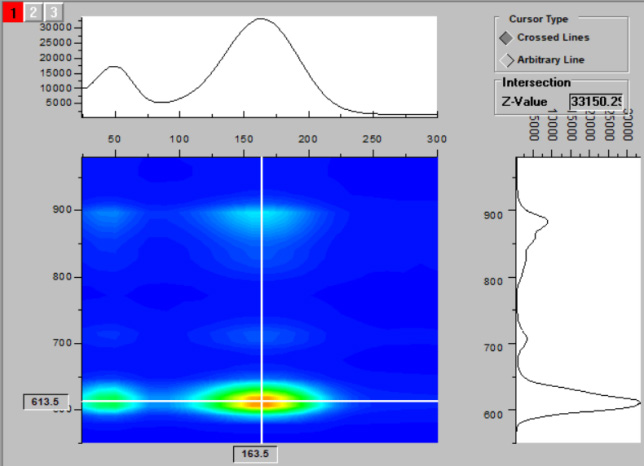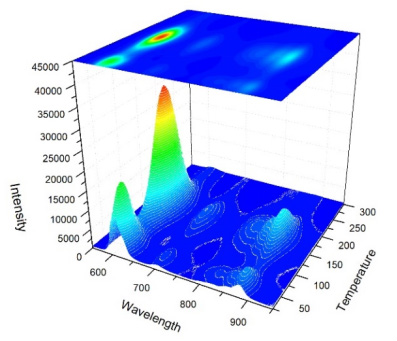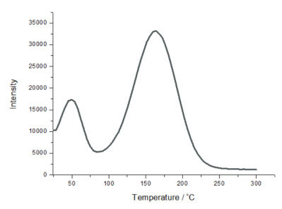 下圖為一種無(wú)機(jī)長(zhǎng)余輝發(fā)光材料的熱釋光三維光譜以及熱釋光溫度譜。溫度變化范圍為 24℃ ~300℃,升溫的速率為50℃ / 分鐘。該樣品在 613.5nm 處有最強(qiáng)的發(fā)光峰,(b) 圖為從熱釋光三維光譜(a)中切片截取得到的熱釋光—溫度譜線,其峰值對(duì)應(yīng)的溫度 Tm=163℃。