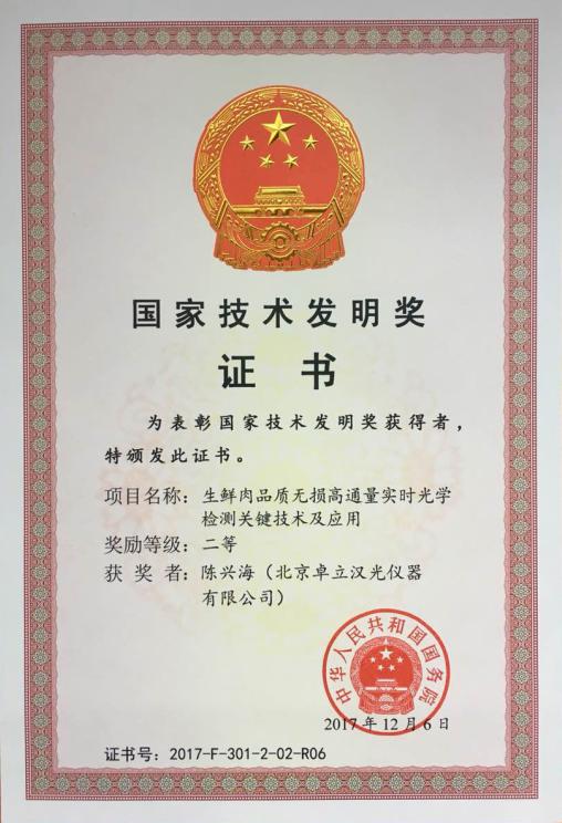 我司技術(shù)總經(jīng)理陳興海與中國農(nóng)業(yè)大學(xué)彭彥昆教授合作完成的“生鮮肉品質(zhì)無損高通量實時光學(xué)檢測關(guān)鍵技術(shù)及應(yīng)用”獲得國家技術(shù)發(fā)明二等獎。