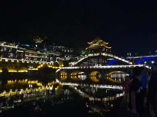 福委會(huì)的小伙伴十分貼心,在安排了兩天緊張的行程后,第三天我們坐車(chē)來(lái)到美麗的小城---鳳凰古城, 晚上自由漫步在美麗的沱江邊上,欣賞古城迷人的夜景,古色古香的吊角群樓外加醉人的酒吧,讓小城的風(fēng)景顯得別致而異常美麗。伙伴們?nèi)宄扇旱芈接谛〕堑拿總€(gè)角落,遠(yuǎn)離城市喧囂,放松著每一根神經(jīng)。