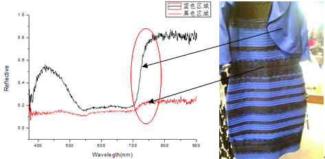 就以這個(gè)服裝的藍(lán)色(或白色)為例,其在430nm有一個(gè)反射峰,對(duì)應(yīng)藍(lán)色。在700nm后反射率升高,而每個(gè)人對(duì)700nm以上波段光的感應(yīng)是不一樣的,在700nm是人眼觀察的紅色至紅紫色區(qū)域,藍(lán)色和黃色、紅色的光混合后會(huì)出現(xiàn)白色光的結(jié)果。也就是說(shuō),有些人能對(duì)近紅外光波段區(qū)域的感應(yīng)相對(duì)寬一些(敏感一些),這就造成了衣服本身是藍(lán)色的,加上相對(duì)黃色光、紅色光感應(yīng)較為敏銳,就會(huì)造成對(duì)衣服顏色的感知為金色的(有一部分會(huì)體現(xiàn)出白色)。而紅光區(qū)域感應(yīng)相對(duì)不敏銳的人則只能夠看到與原來(lái)圖像一致的黑色和藍(lán)色。