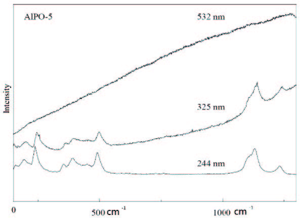 分別采用244nm、325nm、532nm 激光器實(shí)測樣品(AIPO-5 分子篩),可清楚看到紫外拉曼光譜在規(guī)避熒光干擾信號的良好表現(xiàn)。