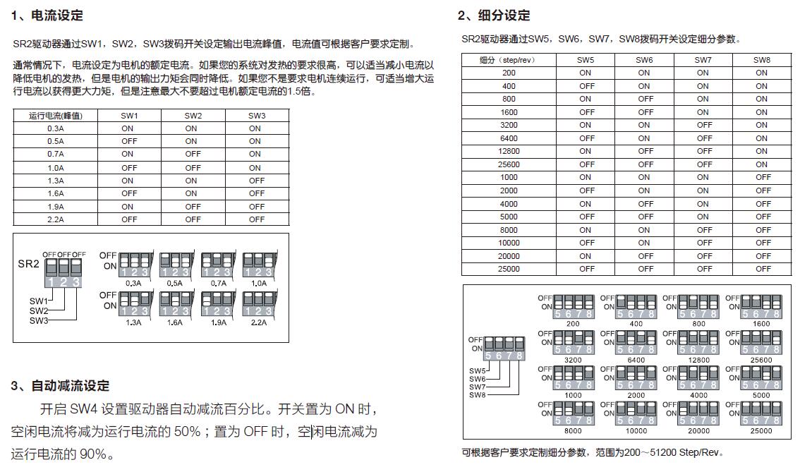 SR 系列兩相步進電機驅動器是基于PID 電流控制算法設計的高性價比細分型驅動器,具有優(yōu)越的性能表現(xiàn),高速大力矩輸出,低噪音,低振動,低發(fā)熱,特別適合OEM 客戶的大批量應用場合。SR2 驅動器可通過撥碼開關選擇運行電流和細分,有16 種細分,8 種電流供選擇,具有過壓,欠壓,相電流過流保護,其輸入輸出控制信號均采用光電隔離。