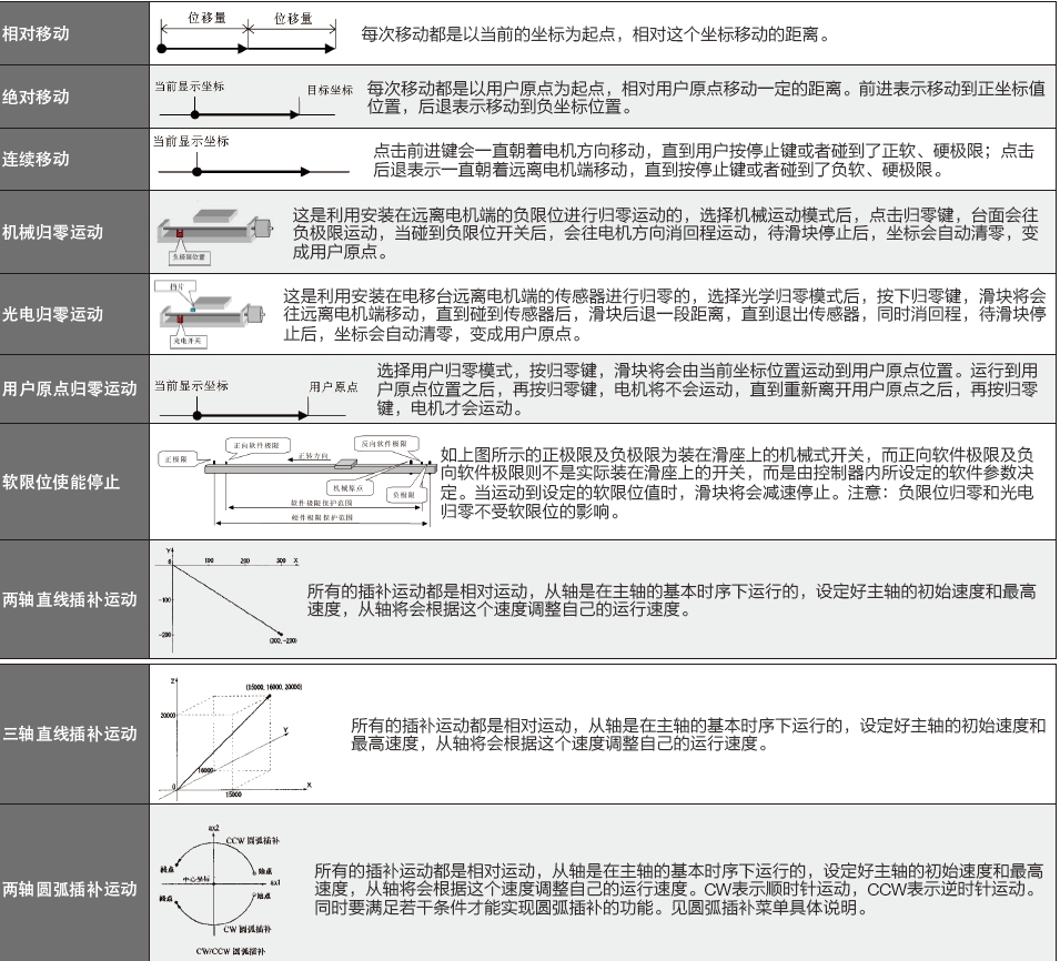 任意2-3軸直線插補(bǔ),任意兩軸圓弧插補(bǔ) |
