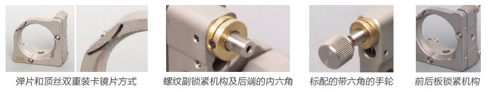 • 雙重裝卡鏡片方式(限標(biāo)準(zhǔn)型):特別設(shè)計(jì)了頂絲推動彈片壓緊鏡片的裝卡方式,一定程度上可避免頂絲或硬性固定引起鏡片變形,提高光路穩(wěn)定性;如果您不想用彈片,可自行將彈片取出,頂絲卡緊鏡片依然起作用;