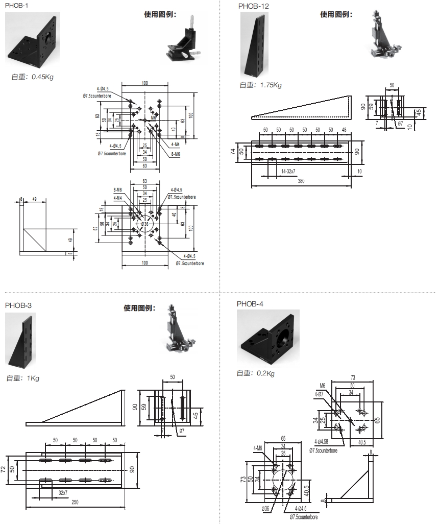 PHOB 系列直角固定塊,設(shè)計(jì)用于將滑臺(tái)組合成兩維或三維正交滑臺(tái),也可將其它調(diào)整架正交組合在一起。兩正交面精密加工,保證垂直度要求。多種安裝孔位設(shè)計(jì)通用性強(qiáng)。