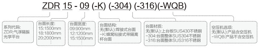 ZDR系列獨立型氣浮隔振光學(xué)平臺選型表: