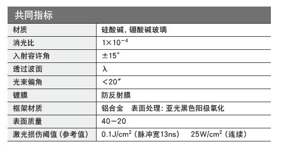 偏振片是用人工方法制成的薄膜,是用特殊方法使選擇性吸收很強的微粒晶體在透明膠層中作有規(guī)則排列而制成的,它允許透過某一電矢量振動方向的光( 此方向稱為偏振化方向),而吸收與其垂直振動的光,即具有二向色性。因此自然光通過偏振片后,透射光基本上成為平面偏振光。一般來說,偏振片損傷閾值較小,而且無法分離出p 偏振光和s 偏振光。