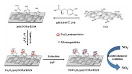 本文在利用粘附機(jī)理在polyDOPA/RGO基板上合成Pd/Fe3O4復(fù)合材料(方案1)。圖1是材料的拉曼光譜和紫外可見光譜,從圖中可以看出,在弱堿性溶液中,氧化石墨烯成功還原為還原氧化石墨烯。拉曼峰ID/IG的比值從氧化石墨烯的0.81提升至polyDOPA/RGO的0.99。在紫外可見光譜中,氧化石墨烯對(duì)應(yīng)的峰位從231nm移至268nm,同時(shí),GO的n→π*躍遷峰消失。
