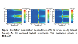 Ag納米棒混合結(jié)構(gòu)的SHG強(qiáng)度最高,Au納米棒混合結(jié)構(gòu)的SHG強(qiáng)度最低,而Au–Ag–Au納米棒混合結(jié)構(gòu)的SHG強(qiáng)度介于兩者之間。這種差異主要?dú)w因于Ag和Au的SPR效應(yīng)以及納米結(jié)構(gòu)設(shè)計(jì)的不同。通過(guò)合理設(shè)計(jì)納米結(jié)構(gòu)和優(yōu)化激發(fā)條件,可以有效調(diào)控SHG強(qiáng)度,實(shí)現(xiàn)對(duì)非線性光學(xué)特性的優(yōu)化
